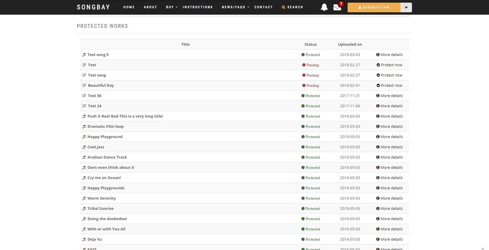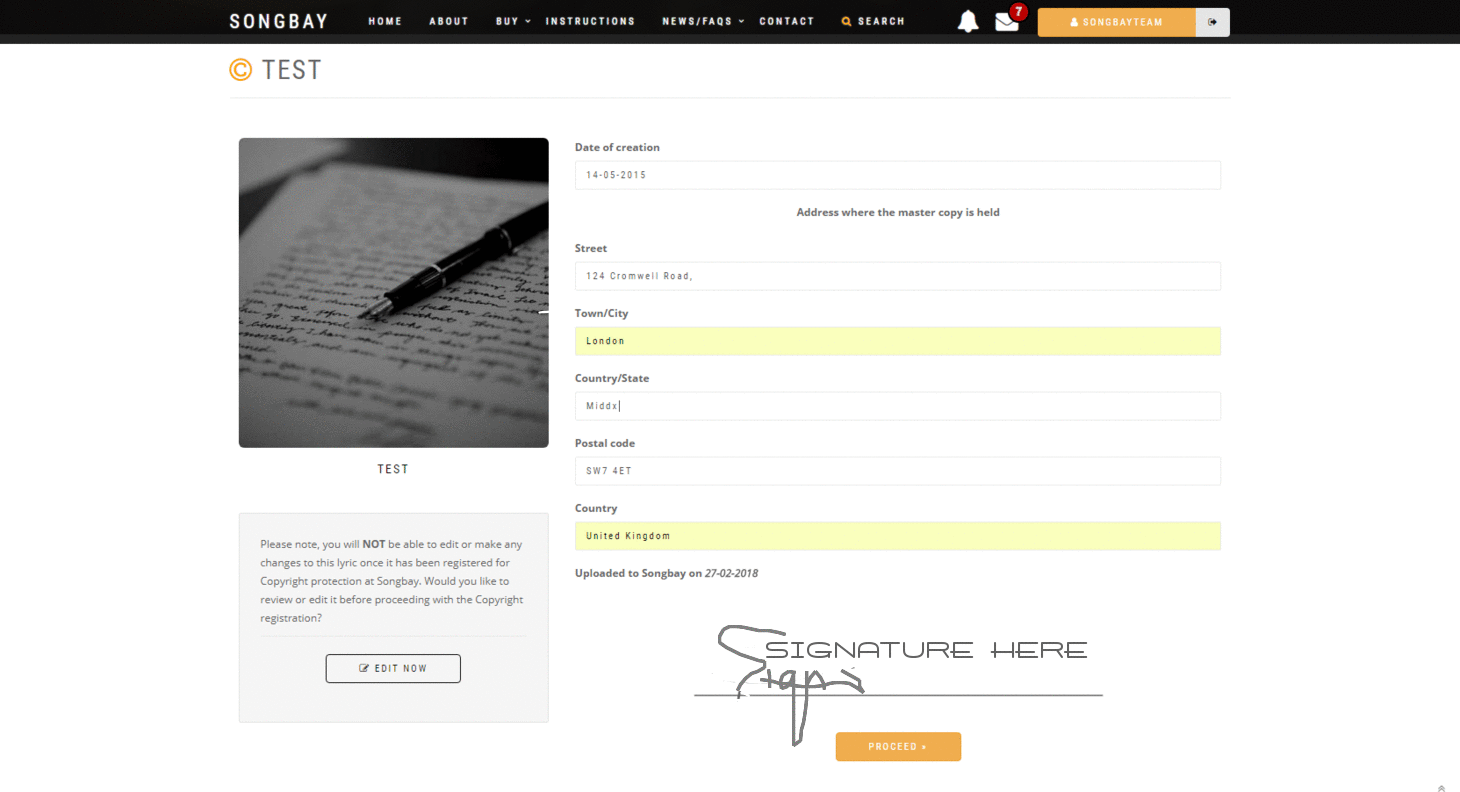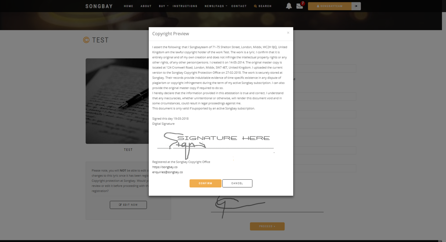 Copyright laws worldwide require that, in any legal dispute, you must prove that you are the original creator of the work. To do so, you need to demonstrate that your work existed before any other version. Songbay makes this easy. Once you’ve completed your song or lyric, simply upload it to Songbay. Each upload receives a unique digital reference, is encrypted, and is time- and date-stamped. We also provide you with access to our comprehensive copyright registration service and issue a copyright certificate for every upload.